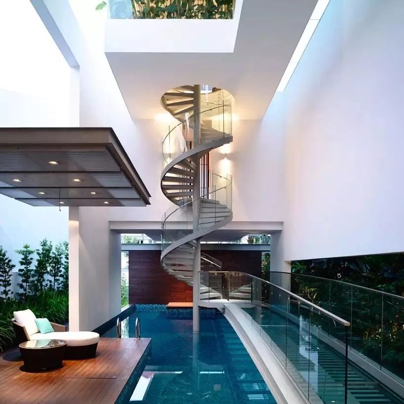 在標準中柱式和板式的基礎上,設計師們可以擴展衍生出新型結(jié)構(gòu)及造型的鋼結(jié)構(gòu)旋轉(zhuǎn)樓梯,看看下面這些案例吧!